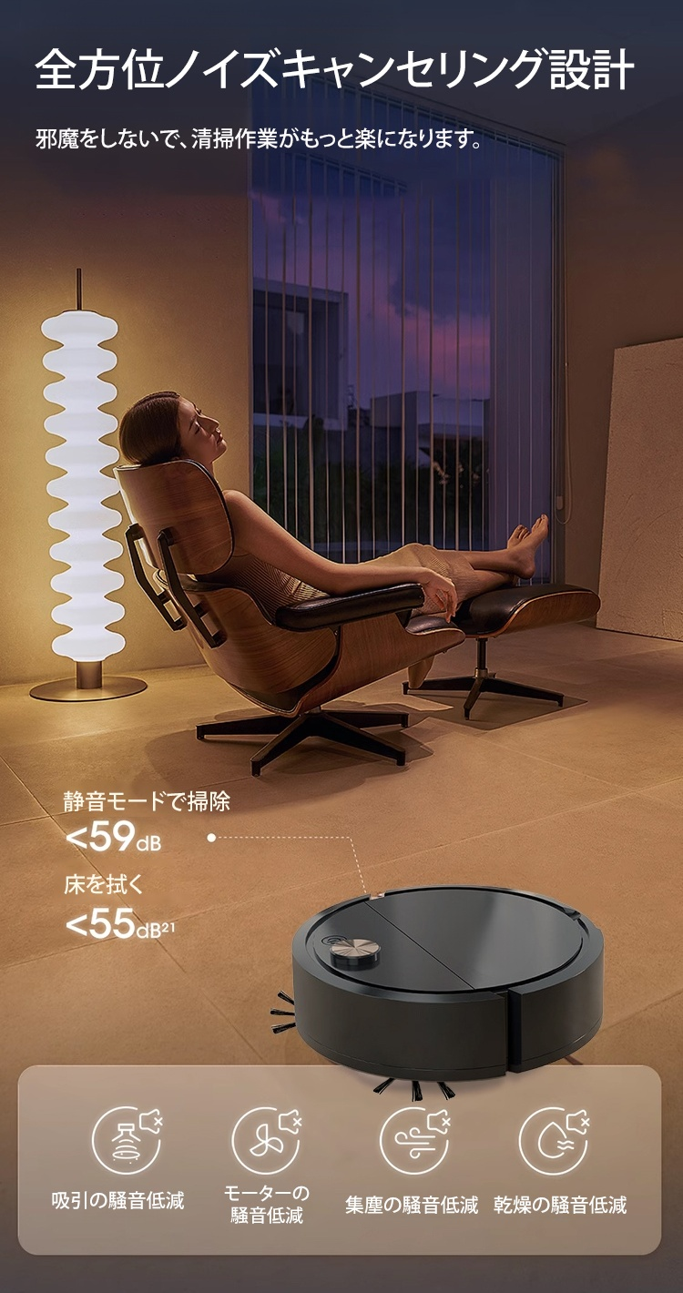 ● 静音設計で夜間や在宅ワーク中でも気にならず、家族やペットにも優しい快適なお掃除を実現します。