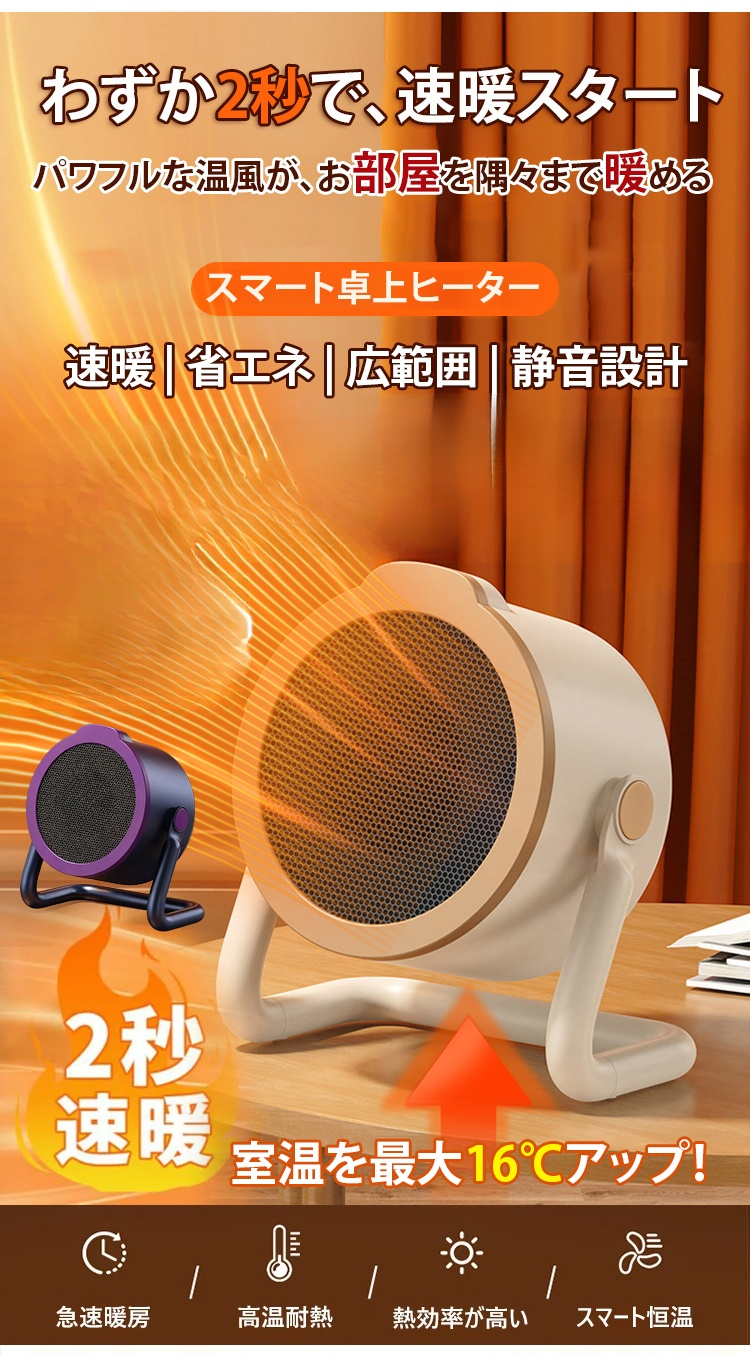 【3秒で30畳の部屋を25度に、電気代24時間1円!】省エネ静音 スマート 卓上ヒーター