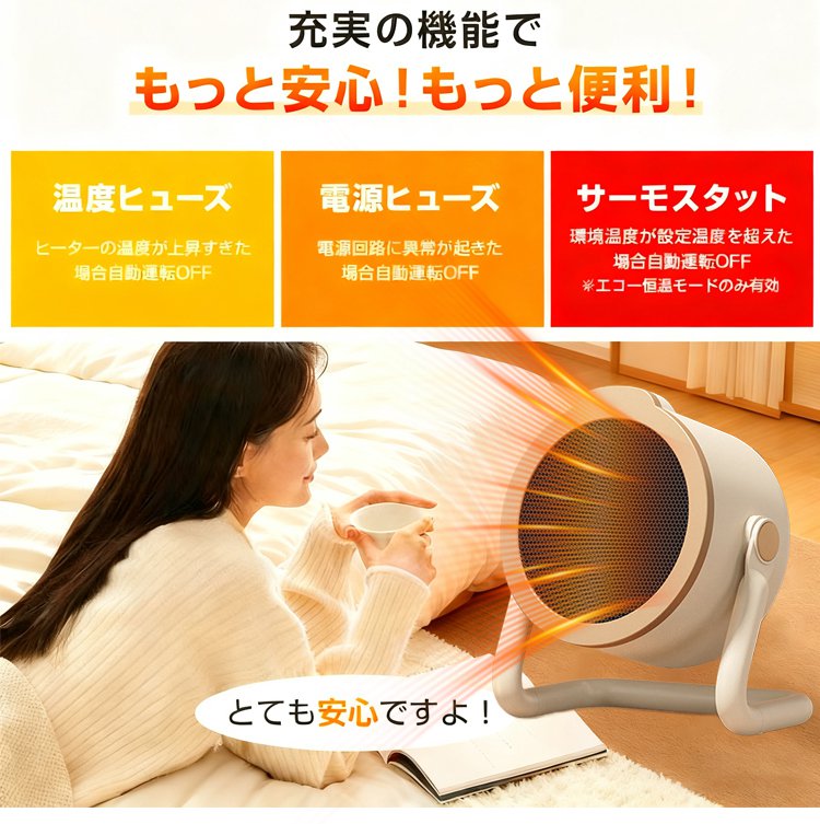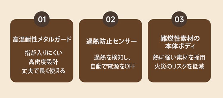 ● 安全機能も充実!自動オフタイマーや過熱防止機能付きで、小さなお子様やペットのいるご家庭でも安心してご利用いただけます。