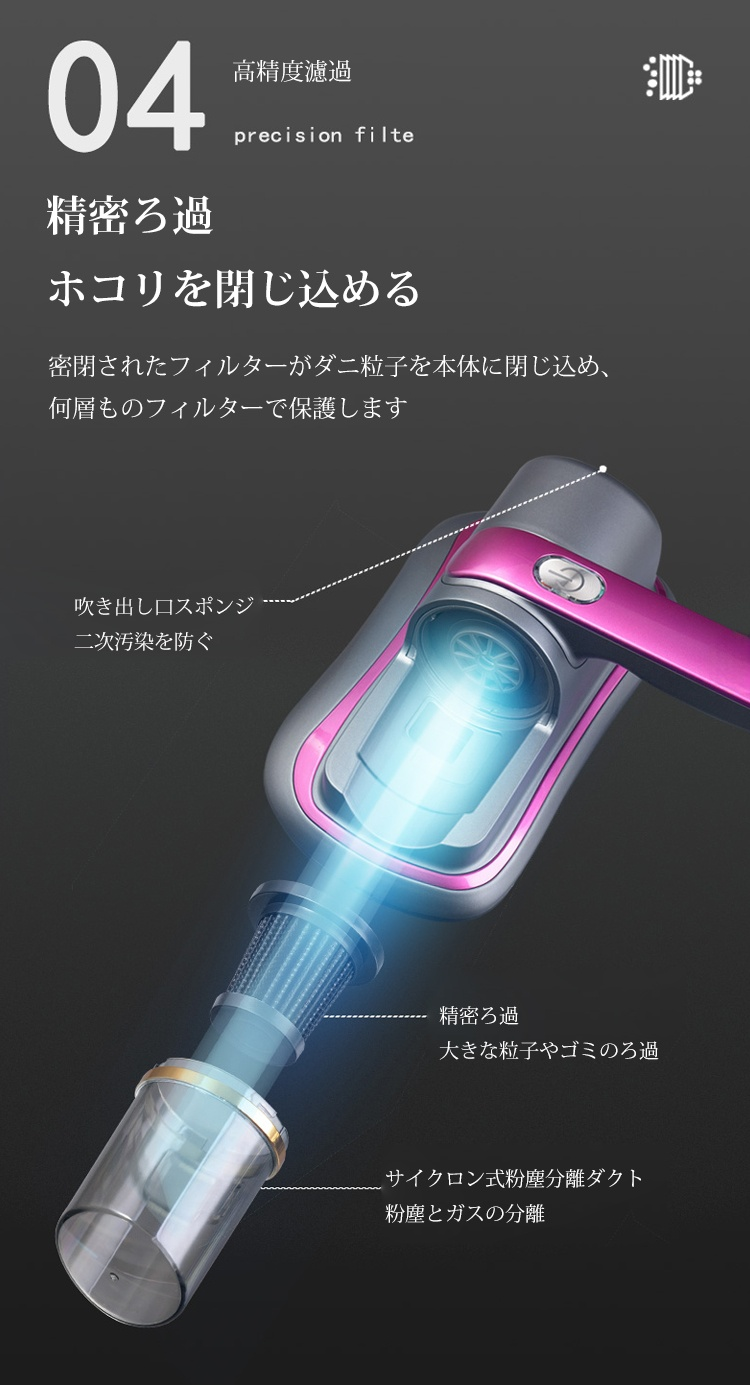 ● ワイヤレス設計で使いやすく、どこでも簡単に除菌・ダニ対策が行えます。
