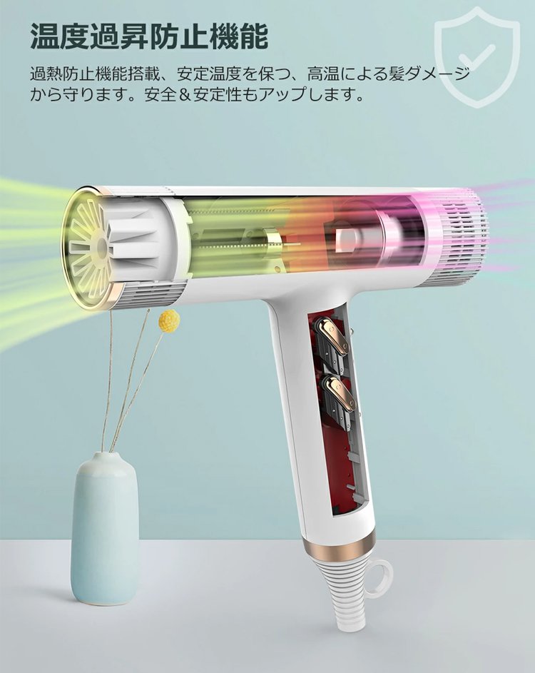 ● マイナスイオン搭載で髪の潤いを守りながら、静電気やパサつきをしっかり抑えます。